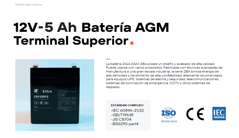 Bateria Agm Ciclo Profundo 12V 5Ah de la serie ZIGA . Está desarrollada con tecnología VRLA de AGM Absorbent Glass Material, diseñadas para una vida útil de 3 a 5 años y destinadas a aplicaciones generales como UPS, telecomunicaciones y aplicaciones eléctricas.
