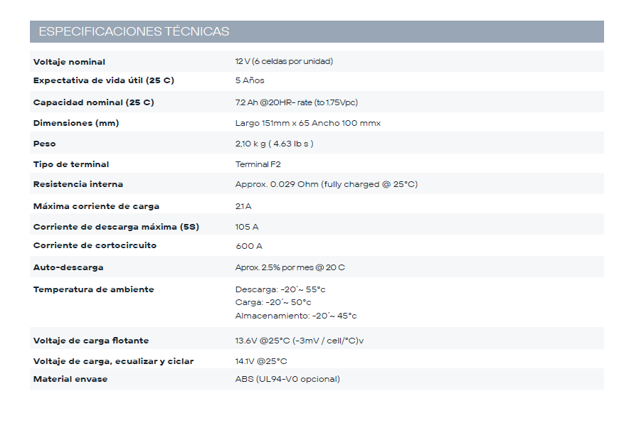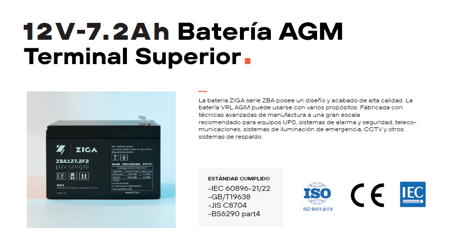 Bateria Agm Ciclo Profundo 12V 7,2 Ah de la serie ZIGA . Está desarrollada con tecnología VRLA de AGM Absorbent Glass Material, diseñadas para una vida útil de 3 a 5 años y destinadas a aplicaciones generales como UPS, telecomunicaciones y aplicaciones eléctricas.